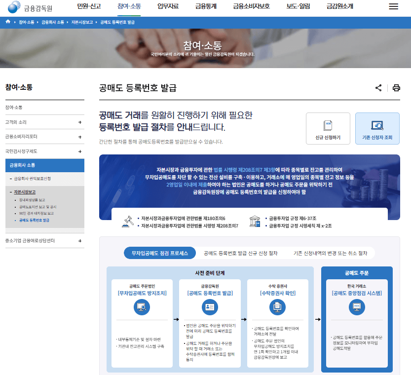 [홈페이지 경로: 참여·소통 > 금융회사 소통 > 자본시장보고 > 공매도 등록번호 발급]