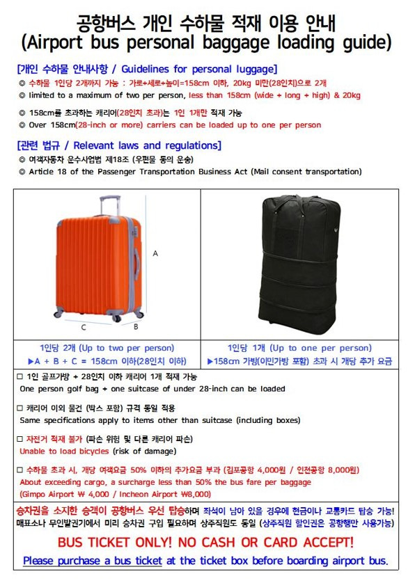 그 이상의 수하물에 대해서는 초과수하물 1개당 버스운임의 50%(8천원)가 발생됩니다.
