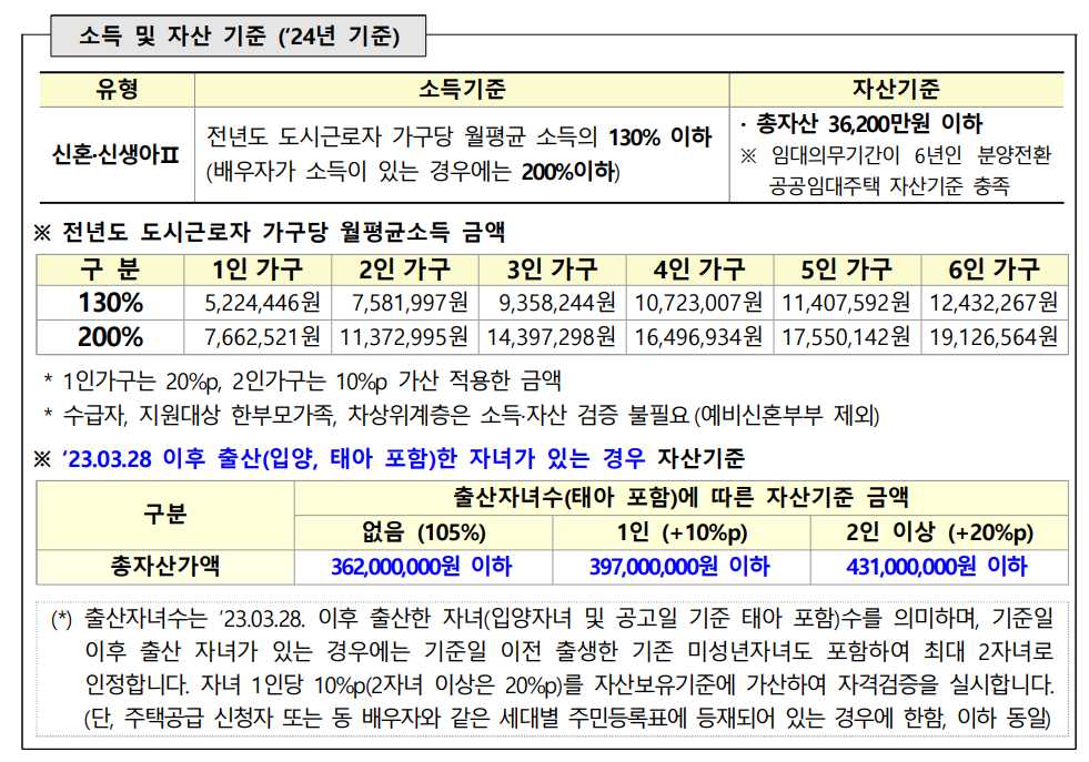 - 2023년 3월 28일 이후 출산(입양, 태아 포함)한 자녀가 있는 경우, 자산 기준 최대 4억 3,100만 원까지 상향 가능
